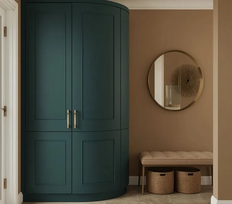 Стильный и функциональный радиусный шкаф в глубоком тёмно-бирюзовом оттенке с матовым покрытием. Его изогнутые фасады создают мягкий силуэт, который гармонично вписывается в интерьер прихожей, спальни или гостиной. Просторное внутреннее пространство позволяет эффективно хранить одежду, обувь и аксессуары, а изящные металлические ручки добавляют современный штрих.