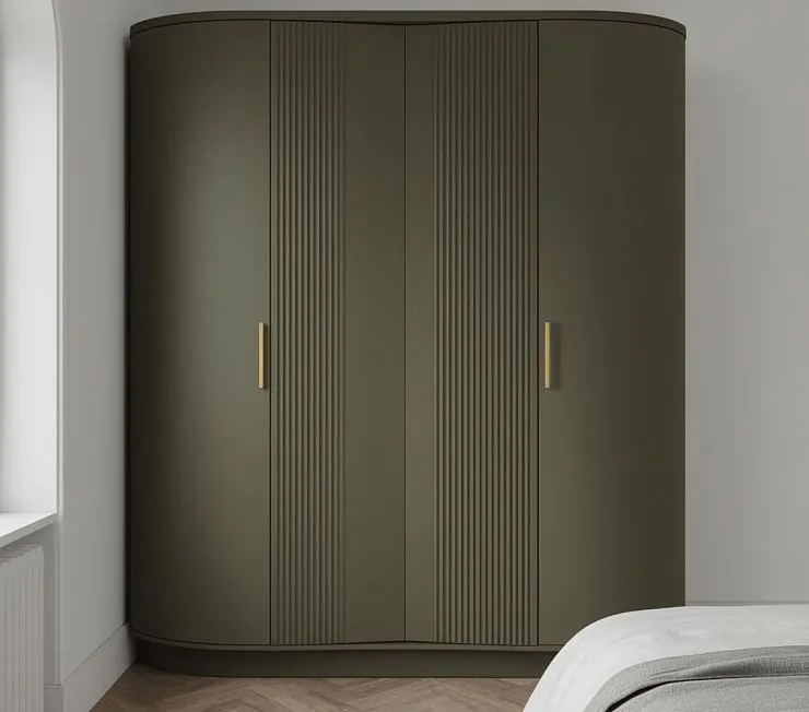 Стильный современный радиусный шкаф в мягком оливковом оттенке, украшенный вертикальными рифлёными панелями. Лаконичные латунные ручки подчёркивают элегантность дизайна. Благодаря округлым углам шкаф гармонично вписывается даже в компактные помещения, создавая атмосферу уюта и уединения.