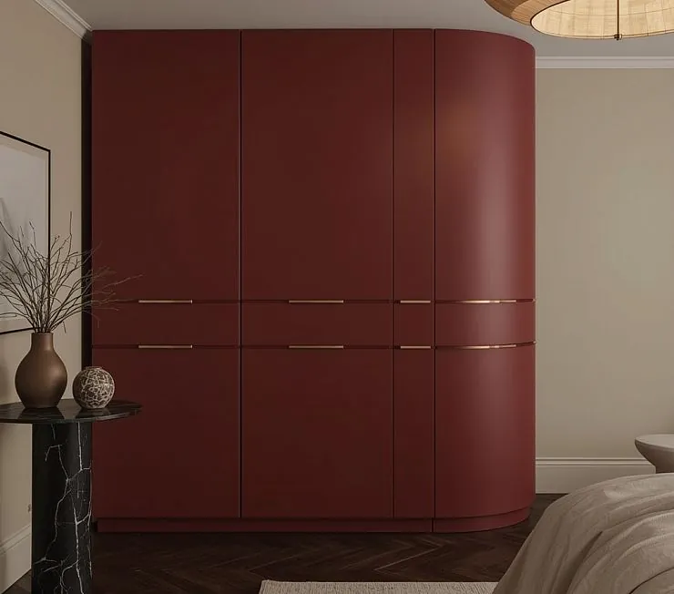 Стильный современный радиусный шкаф, выполненный в насыщенном бордовом оттенке с элегантными латунными ручками. Фасады имеют матовое покрытие, подчеркивающее глубину цвета, а плавные округлые формы добавляют интерьеру мягкости и утонченности. Встроенные выдвижные секции обеспечивают удобное хранение.