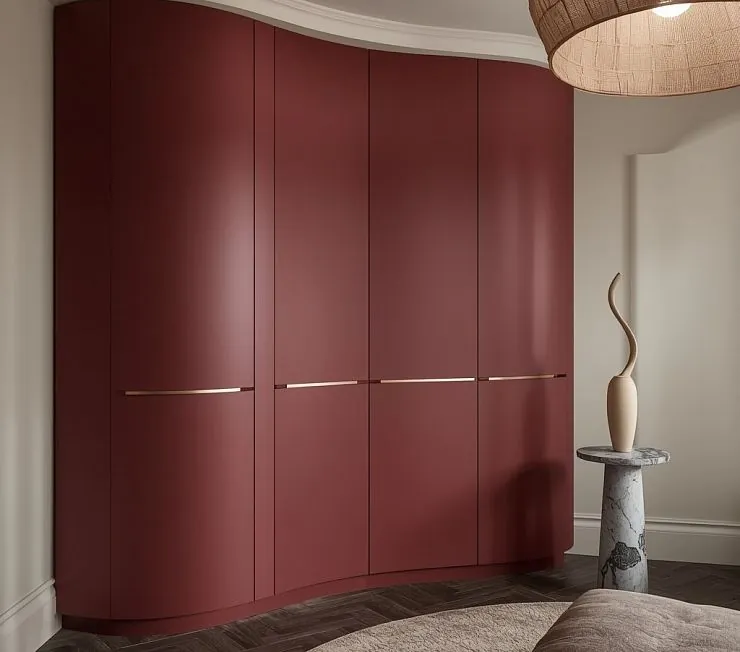 Стильный радиусный шкаф в насыщенном бордовом цвете, дополненный тонкими горизонтальными ручками в золотистом оттенке. Гладкие фасады без лишнего декора подчеркивают современный и минималистичный дизайн, а плавные линии корпуса делают модель особенно изящной. Идеально подойдёт для спальни или гостиной в премиальном стиле.