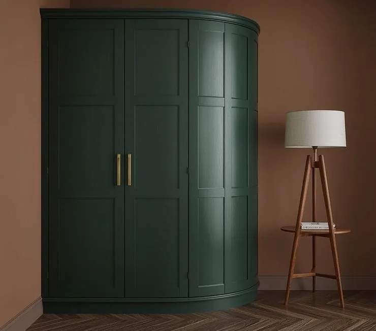 Современный радиусный шкаф в благородном оттенке лесной зелени с изысканными латунными ручками. Фасады оформлены в классическом филёнчатом стиле, а округлая форма добавляет интерьеру мягкости и гармонии. Выполнен из качественных материалов, сочетает стиль и функциональность, идеально подходит для спальни или гостиной.