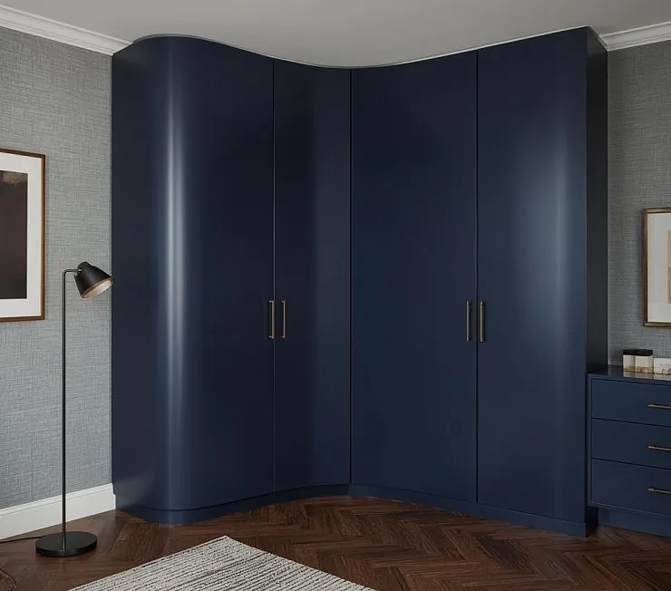 Элегантный радиусный шкаф в насыщенном тёмно-синем оттенке с аккуратными медными ручками. Лаконичные глянцевые фасады и плавные линии создают современный и изысканный образ, а угловое исполнение позволяет эффективно использовать пространство комнаты. Отлично впишется в интерьер спальни, кабинета или гостиной.