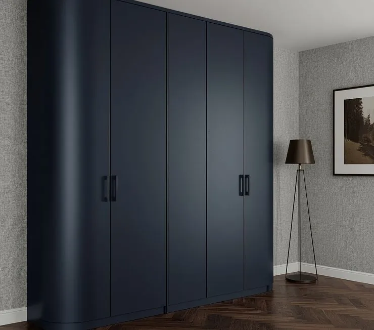 Элегантный радиусный шкаф глубокого тёмно-синего оттенка. Гладкие матовые фасады создают современный и лаконичный образ, а чёткие вертикальные линии и интегрированные чёрные ручки подчеркивают строгий стиль. Идеален для интерьеров в минималистичной или современной эстетике, обеспечивая вместительное и удобное хранение.