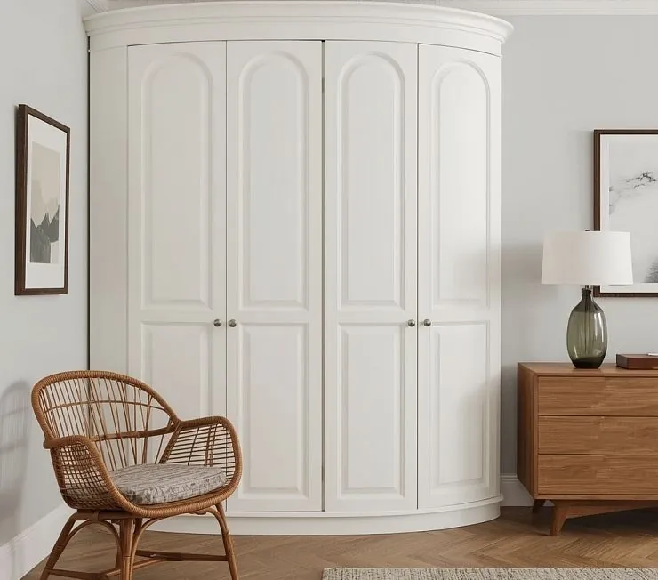 Элегантный угловой шкаф с мягкими радиусными линиями и классическими филёнчатыми фасадами в тёплом оттенке слоновой кости. Компактный, но вместительный, он прекрасно подойдёт для спальни или гостиной в классическом или неоклассическом стиле. Изящные круглые ручки дополняют изысканный облик.