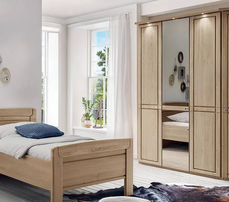 Естественное совершенство натуральной древесины и ее неповторимая текстура - лучшее украшение для вашей спальни или гардеробной. Фасады выполнены из массива дуба, корпус системы хранения - из ламинированной ДСП “Эггер”. Центральная секция - зеркало с серебряным напылением. По желанию дуб заменяется на массив из натурального ясеня. Обязателен предварительный замер нашим дизайнером: мебель изготавливается под заказ.