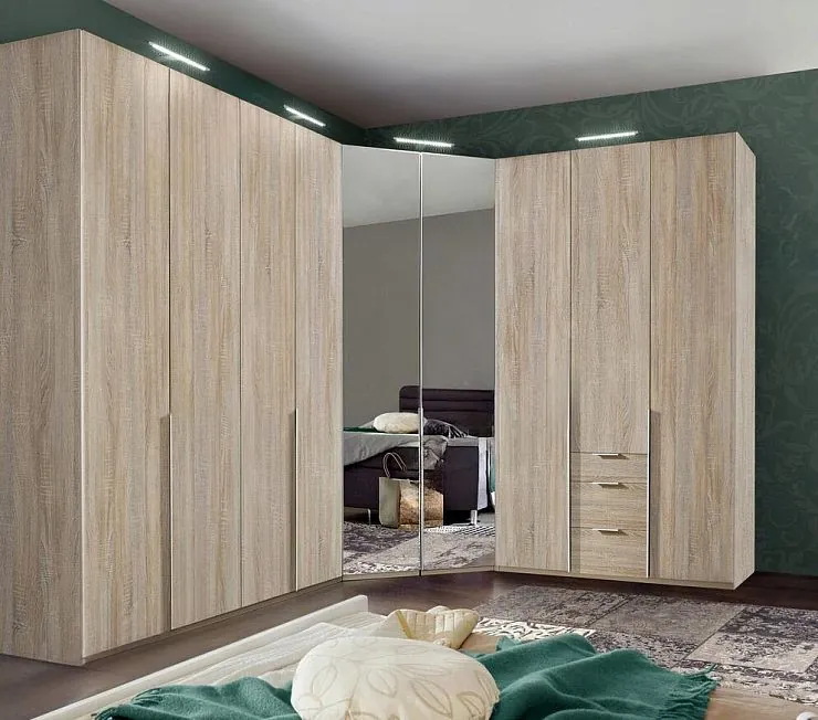 Большой набор корпусной мебели для прихожей или спальни за небольшую цену. Светлый серо-коричневый цвет под натуральное дерево. Большое зеркало на угловом шкафу. Материал ЛДСП "Egger".