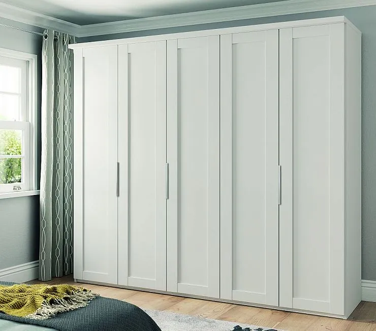 Современная версия классического платяного шкафа с рельефными фасадами из МДФ в белой эмали. Внутреннее наполнение включает пространство со штангой для верхней одежды, ниши для обуви, выдвижные ящики для белья. Верхняя антресоль позволяет разместить массивные предметы. Корпус - премиум-ЛДСП от "Egger", фурнитура “Blum”. Изготовление - только на заказ, потребуется замер помещения.