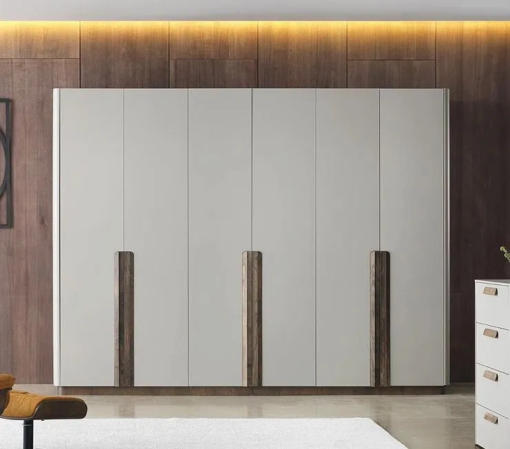 Нестандартное сочетание фасадов в матовой светлой эмали и ручек-накладок в натуральном дубовом шпоне с его глубокой, благородной текстурой. Шкаф отличается высокой вместительностью: к вашим услугам три секции с областями для хранения верхней, домашней одежды, аксессуаров и обуви. Корпус мебели выполнен из ЛДСП “Эггер”, фасады - из МДФ, для ручек использовано шпонирование. Для заказа необходим замер от нашего дизайнера.
