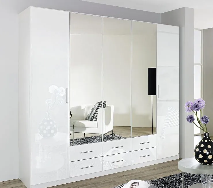 Большой прямой шкаф с панорамным серебряным зеркалом в белом глянце великолепно смотрится в просторной гостиной, коридоре или спальне.Центральные створки имеют зеркала без рамок, что визуально увеличивает размеры помещения. Имеется шесть выдвижных ящиков. Шкаф может быть оборудован в гардеробном наполнении. Материал корпуса ЛДСП "Egger", фасадов - МДФ в глянцевой эмали. Понадобится предварительный визит нашего специалиста для замера.