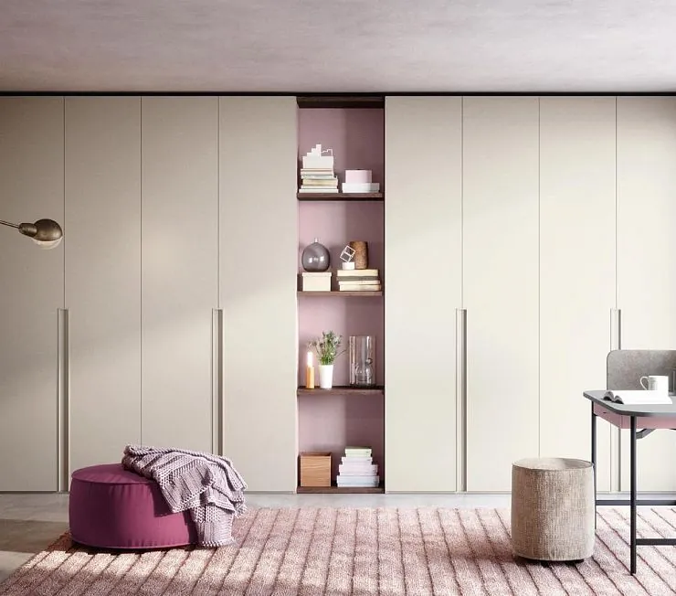 Стильная, эргономичная, привлекающая внимание своим дизайном и размерами система хранения. Занимая всю высоту спальни или гостиной в исполнении под потолок, способна полностью вместить гардероб, обувь и аксессуары всей семьи. Распашные фасады из МДФ в гладкой матовой эмали элегантно смотрятся в комбинации с центральной открытой секцией для хранения книг, альбомов, аксессуаров и фото. Корпус - ЛДСП “Egger”. Изготавливается только под заказ, потребуется выезд нашего специалиста-замерщика.