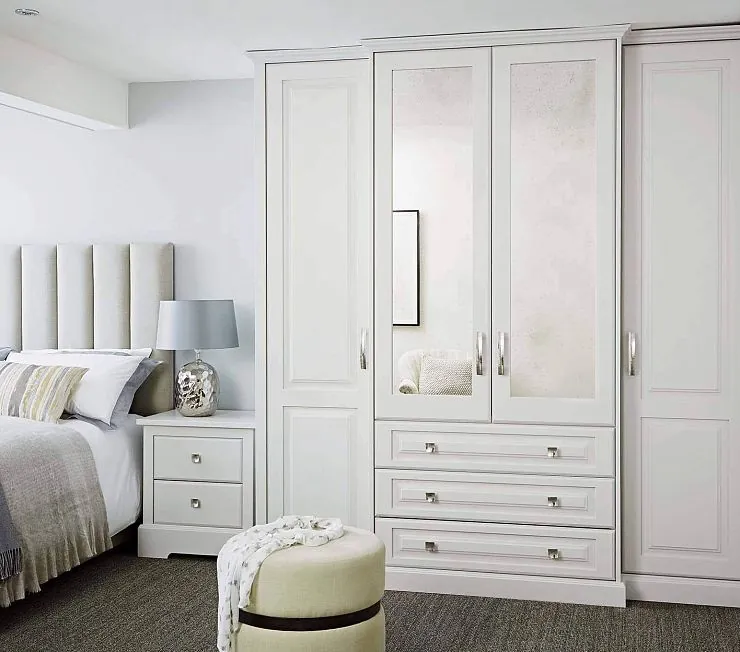 Белый шкаф для спальни или маленькой гостиной. 4-х створчатый шкаф с узкими секциями от пола до потолка с карнизом в классическом стиле. Центральные двери с зеркалами и тремя широкими выдвижными ящиками. Материал корпуса ЛДСП "Egger", фасады - МДФ в матовой эмали, зеркало серебро.