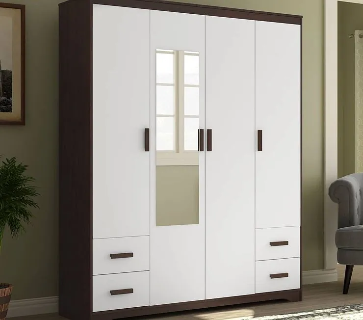 Вместительный небольшой шкаф с зеркалом - отличный вариант для небольших помещений. Элегантное сочетание темно-коричневого корпуса и белых матовых распашных фасадов подойдет для спальни, прихожей, гостиной или коридора в неброских тонах. Оборудован блоками по 2 выдвижных ящика, которые устанавливаются в боковых секциях. Изготавливается из премиального ЛДСП “Egger” (Австрия) с использованием надежной фурнитуры “Blum”. Производство - индивидуальное, под размеры помещения.