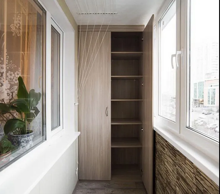 Классическая модель шкафа с полками для балкона, где установлено остекление. При заказе шкафа во встроенном варианте вы более полно используете пространство балкона. А если заказать корпусную версию шкафа получите возможность переставить шкаф в другое место. Материал мебели на выбор покупателя. ЛДСП практично и экономно для бюджета. Натуральный массив - экологично и престижно. Допускается комбинирование разных материалов.