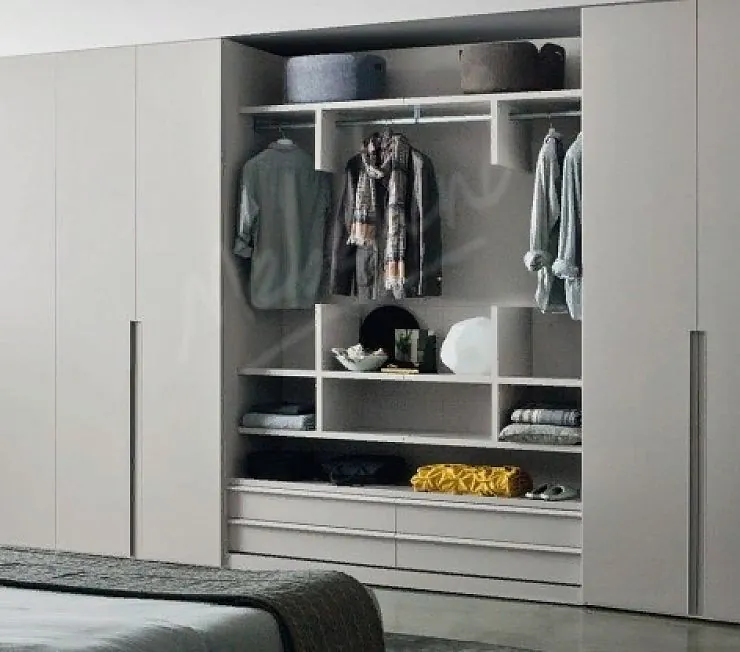 Мебель под заказ, включающая три распашных двухдверных шкафа и открытый отдел с полками, ящиками и штангой