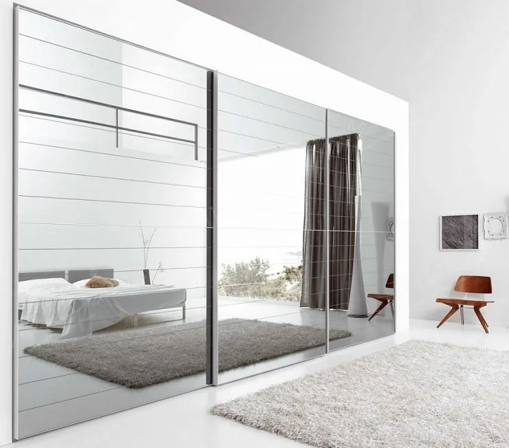 Фасад с зеркалом, декорированным тонкими полосами, отлично расширяет пространство, добавляет свет, вписывается в любой интерьер