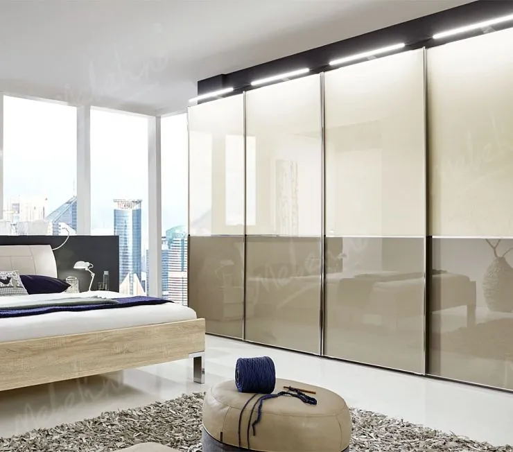 Вместительная модель до самого потолка, в теплом бежевом цвете, ненавязчиво отражающая обстановку комнаты. Авторский проект. Предмет уникальный и сложный, реализован мастерами с большим опытом.