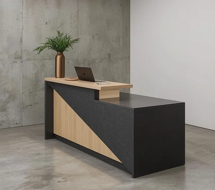Стильная и функциональная стойка ресепшн в актуальном сочетании натурального дуба и чёрного матового каменного декора. Геометрическая вставка в виде диагонального треугольника придаёт дизайну выразительность. Стойка выполнена в форме П-образного моноблока с приподнятой рабочей зоной. Отлично подойдёт для креативных офисов, шоурумов или современных коворкингов.