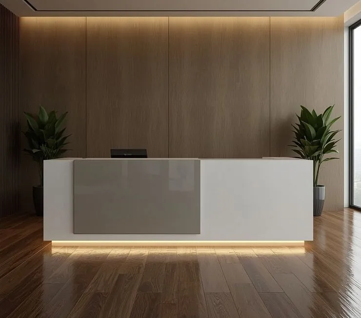 Ресепшн стильная стойка в белом матовом и глянцевом оформлении