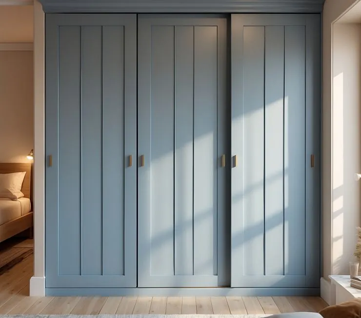 Шкаф Riviera — это скандинавская свежесть в классическом прочтении. Его фасады окрашены в утончённый голубой оттенок, создающий ощущение спокойствия и лёгкости. Прямые вертикальные фрезеровки подчеркивают высоту конструкции, а лаконичные латунные ручки добавляют современную ноту в образ.