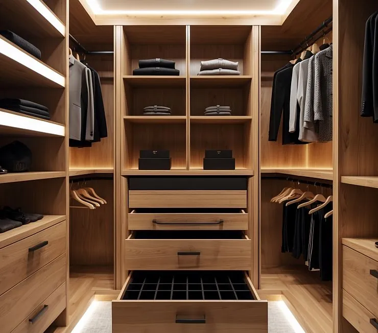 Эта роскошная гардеробная сочетает в себе стиль и практичность, с элегантными деревянными полками и встроенным освещением. Встроенные ящики с разделителями идеально подходят для хранения аксессуаров и обуви. Пространство организовано для удобства с местами для верхней одежды и аккуратно сложенных вещей. Теплый оттенок дерева и минималистичный стиль создают уютную атмосферу.