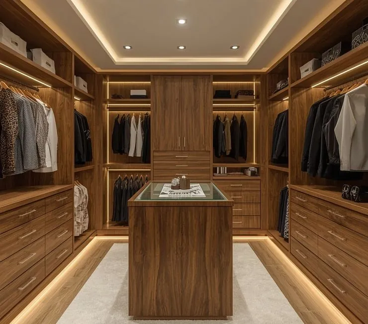 Элегантная и функциональная гардеробная, выполненная из МДФ с отделкой шпоном американского ореха. Встроенные секции для одежды и обуви дополнены стеклянной витриной в центральном острове, что позволяет стильно хранить аксессуары и украшения. Подсветка по периметру полок и потолка создаёт мягкое и уютное освещение, подчеркивая богатую текстуру дерева.