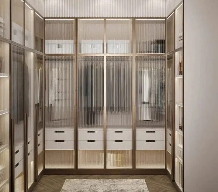 Встроенный гардеробный шкаф премиум класса с полупрозрачными распашными дверьми. Оборудован штангами, выдвижными ящиками и полками для обуви и шапок. Используется австрийская и немецкая фурнитура высокого качества. Изготавливается под разные размеры помещений.
