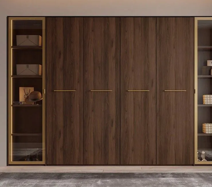 Встроенный в стену прямой шкаф с распашными дверями в стиле модерн. Фасад средних секций выполнен под натуральное дерево. В крайних секциях - витрины за стеклянными дверцами. Более чем полная альтернатива мебельной стенки.