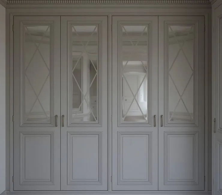 Четырёхдверный встроенный шкаф в классическом стиле с фацетированными зеркалами и декоративной раскладкой в виде ромбов. Фасады дополнены фрезеровкой в нижней части, ручки — в стиле «античная бронза». Изделие выполнено в изысканном серо-бежевом цвете, придающем помещению благородство и свет.