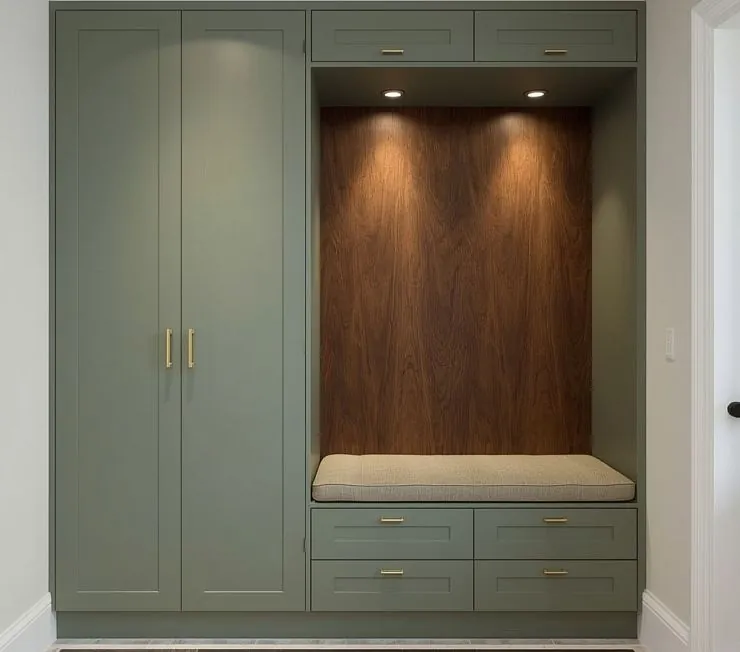 Элегантный встроенный шкаф в современном исполнении с фасадами из МДФ, окрашенными в утончённый оттенок шалфея. Центральная ниша с мягким сиденьем и деревянной панелью создаёт тёплый акцент и добавляет функциональность. Нижние выдвижные ящики и антресоли обеспечивают удобное хранение.