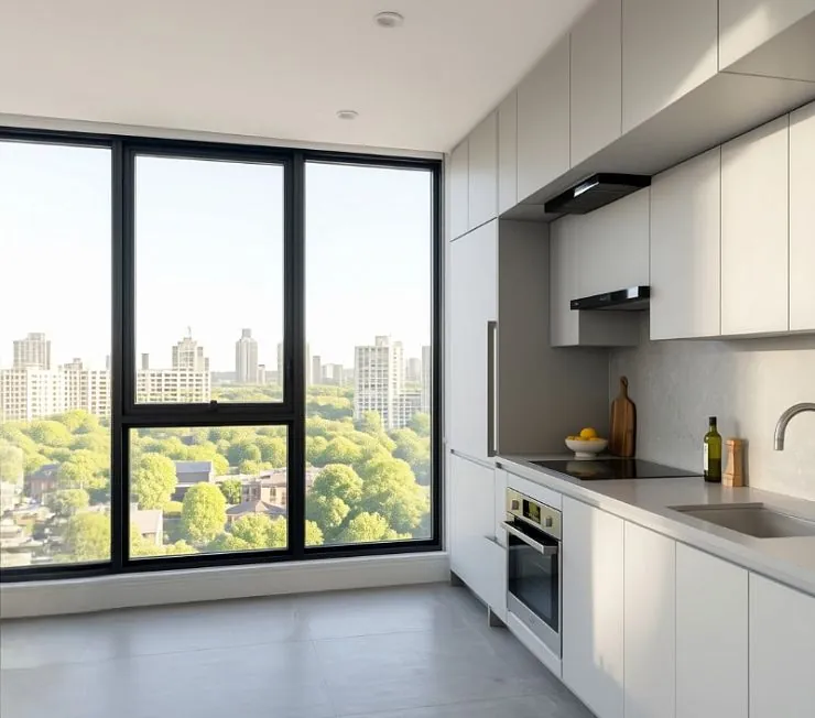Панорамное остекление в чёрных алюминиевых рамах наполняет кухню светом и делает городской пейзаж частью интерьера. Эта кухня — для тех, кто считает серый не скучным, а самодостаточным. Закажите кухню в монохромной палитре по вашим размерам — мы подберём точные оттенки серого для вашего пространства.