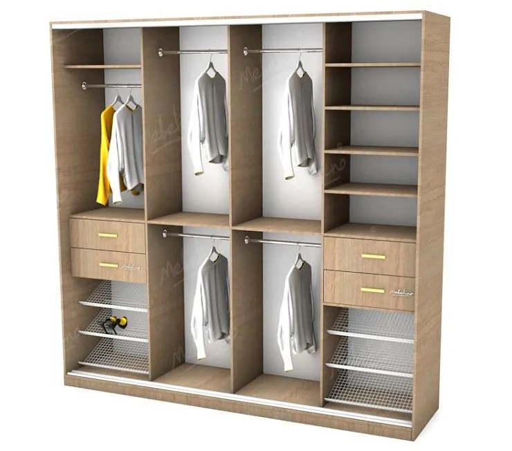 В наполнении данного шкафа используются: 7 полок; 4 ящика; 4 штанги; 6 обувниц.