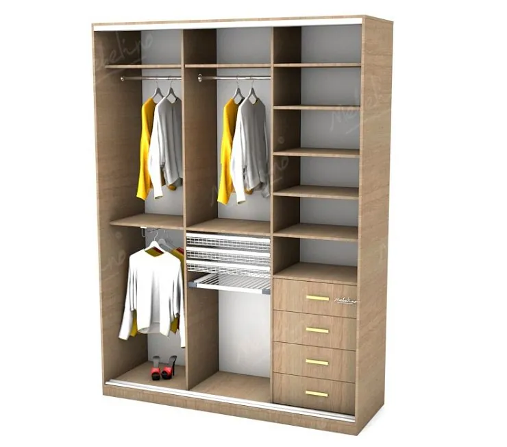 В наполнении данного шкафа используются: 9 полок; 2 штанги; 4 ящика; 1 полки для брюк; 3 выдвижных полки для рубашек; 1 торцевая вешалка.