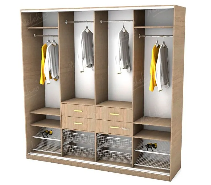 В наполнении данного шкафа используются: 6 полок; 4 ящика; 4 штанги; 4 обувницы; 4 корзины.