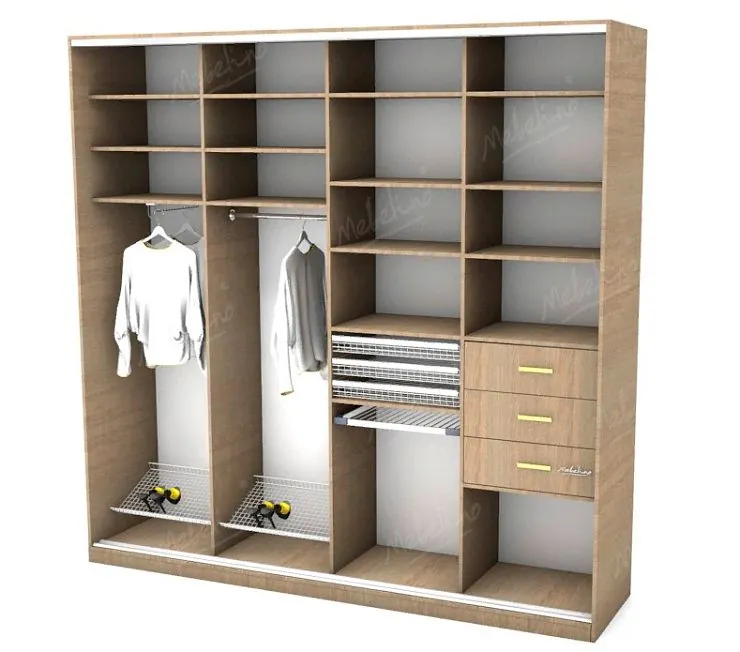 В наполнении данного шкафа используются: 12 полок; 1 штанга; 3 ящика; 1 полки для брюк; 3 выдвижных полки для рубашек; 2 обувницы; 1 торцевая вешалка.