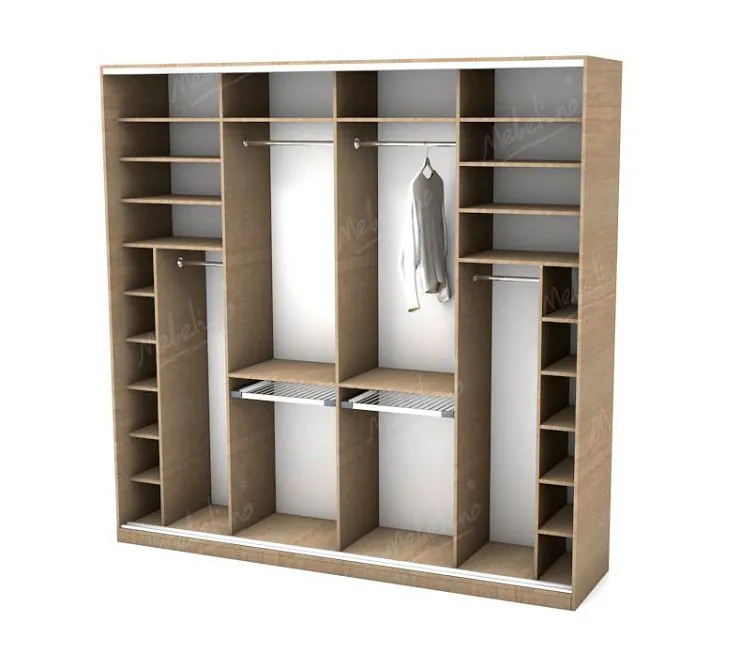 В наполнении данного шкафа используются: 22 полки; 4 штанги; 2 полки для брюк.