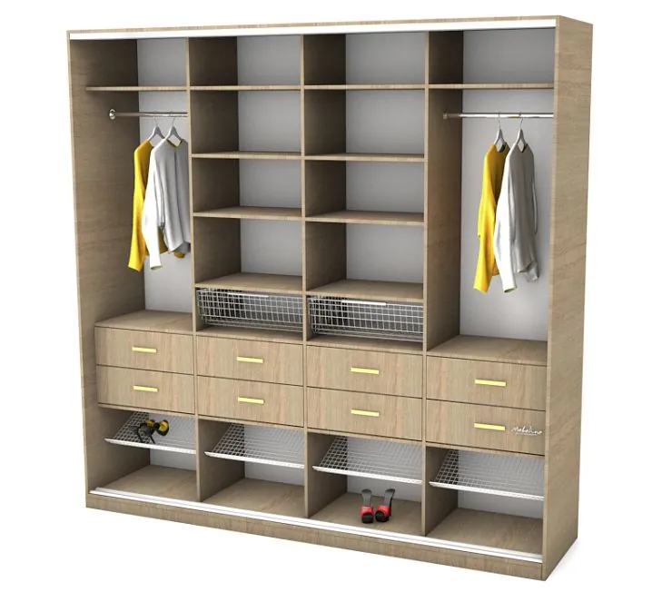 В наполнении данного шкафа используются: 10 полок; 8 ящиков; 2 штанги; 2 корзины; 4 обувницы.