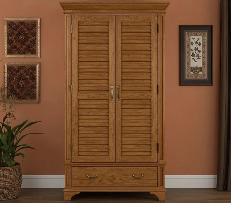 Компактный двухдверный шкаф в классическом стиле, выполненный из дубового шпона. Дверцы с ламельной отделкой обеспечивают вентиляцию, а нижний выдвижной ящик даёт дополнительное место для хранения. Идеален для спальни или прихожей в традиционном интерьере.