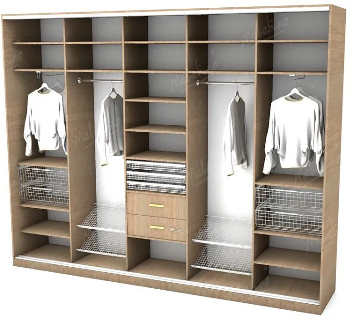 В наполнении данного шкафа используются: 16 полок; 2 штанги; 4 обувницы; 3 выдвижные полки для рубашек; 2 торцевых вешалки; 4 корзины.