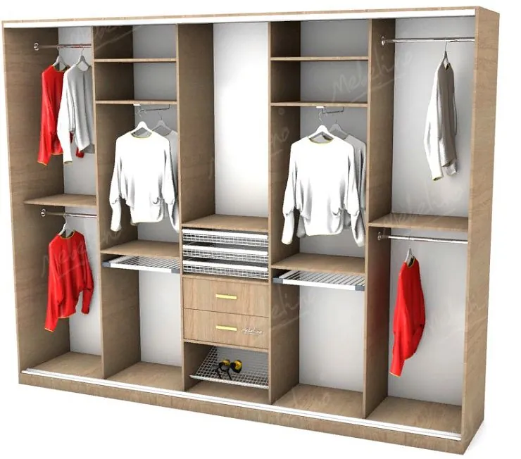 В наполнении данного шкафа используются: 8 полок; 4 штанги; 1 обувница; 2 ящика; 2 полки для брюк; 3 выдвижные полки для рубашек; 2 торцевых вешалки.