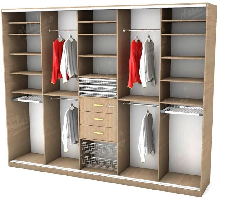 В наполнении данного шкафа используются: 15 полок; 5 штанги; 3 ящика; 2 полки для брюк; 2 корзины; 3 выдвижные полки для рубашек.