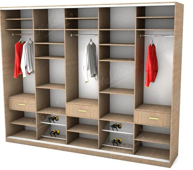 В наполнении данного шкафа используются: 19 полок; 3 штанги; 3 ящика; 4 обувницы.