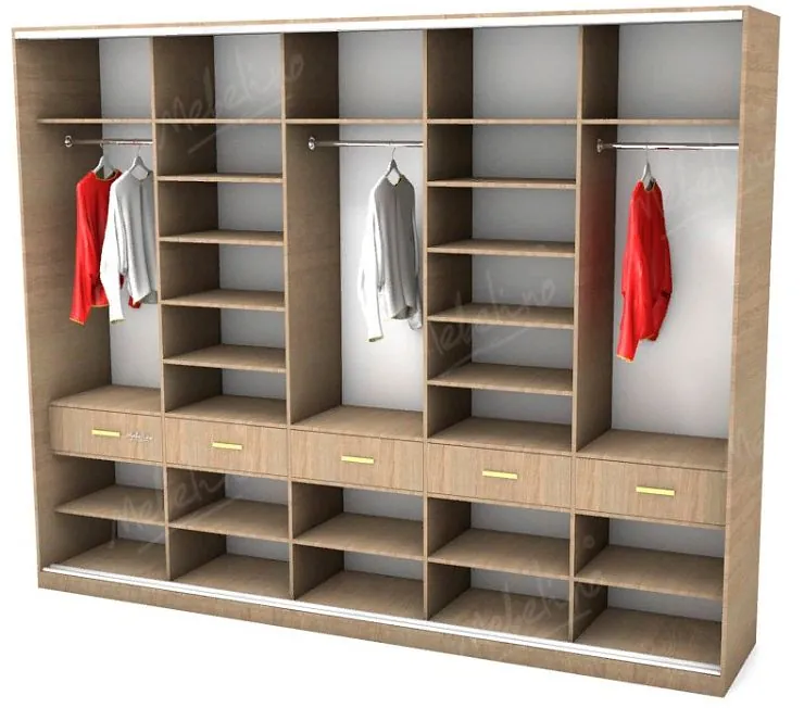 В наполнении данного шкафа используются: 18 полок; 3 штанги; 5 ящиков.
