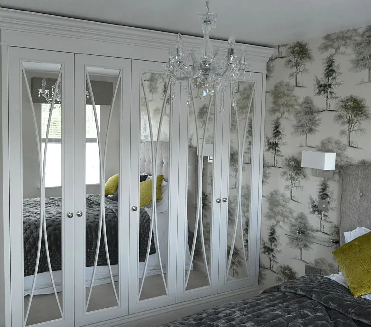 Изящная модель из массива дерева для спальни в исполнении “под потолок”. Оригинальные створки фасадов, зеркала со шпросами в полный рост и резной карниз смотрятся стильно и дорого. Отличный выбор для тех, кто предпочитает нестареющую классику. Изготовление - только под заказ, с выездом замерщика.