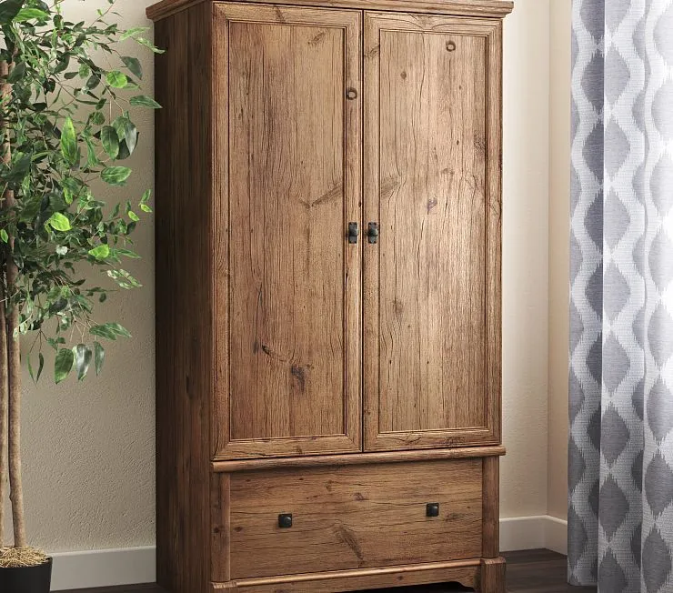 Маленький платяной шкаф с распашными дверями и наружным ящиком. Глянцевый лак сохраняет естественную красоту древесины. Такая мебель украсит интерьер помещения в стиле прованс. Внутренне наполнение платяного шкафа можно откорректировать для спальни, гардероба или прихожей при оформлении заказа.