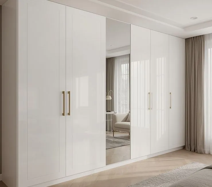 Современный встроенный шкаф с фасадами в белом глянцевом исполнении и центральной зеркальной дверью, которая визуально увеличивает пространство комнаты. Лаконичный дизайн с ровными линиями и золотистыми ручками делает его универсальным решением для спальни или гардеробной. Вместительное внутреннее наполнение обеспечивает удобное хранение одежды и аксессуаров.