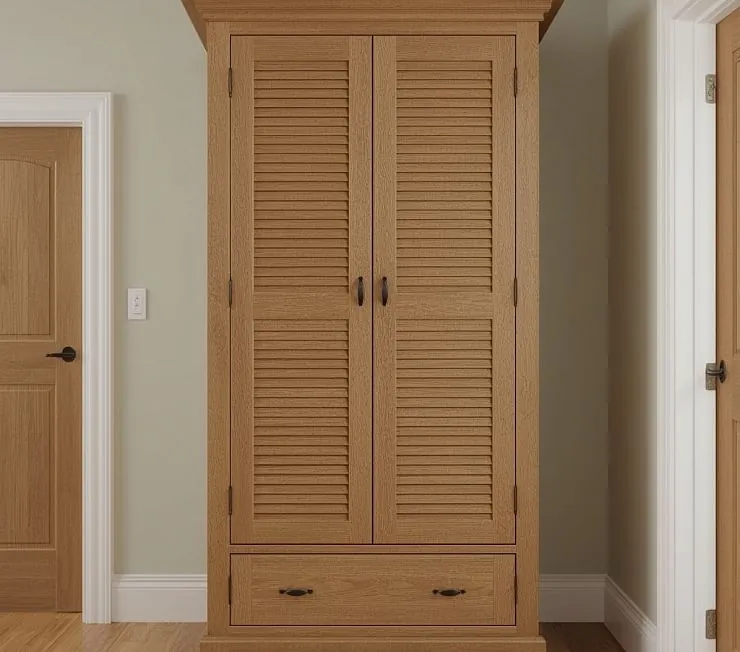 Компактный классический шкаф из натурального дуба с двумя дверцами-жалюзи для вентиляции и вместительным нижним выдвижным ящиком. Идеален для хранения одежды в спальне или прихожей.