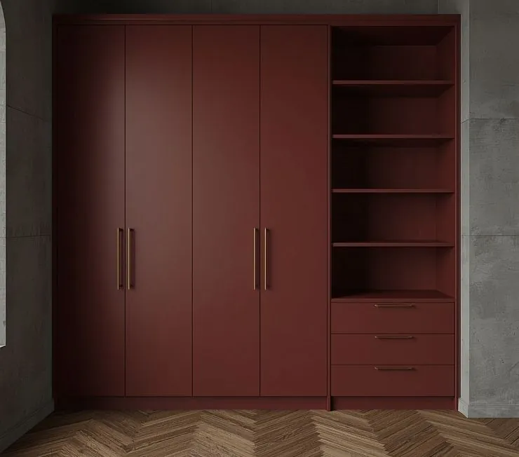 Встроенный шкаф в глубоких бордовых матовых фасадах с симметричными вертикальными ручками цвета тёплой бронзы. Правая секция оснащена открытыми полками и тремя выдвижными ящиками, обеспечивая удобный доступ и визуальную лёгкость конструкции. Лаконичный дизайн идеально сочетается с современными и индустриальными интерьерами.