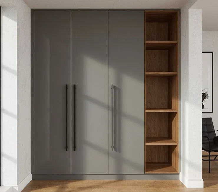 Встроенный шкаф в матовом сером цвете с открытыми нишами из теплого дуба. Высокие черные ручки подчеркивают минималистичный стиль, а открытые полки добавляют функциональности и позволяют разместить декор или книги. Идеален для современных интерьеров.