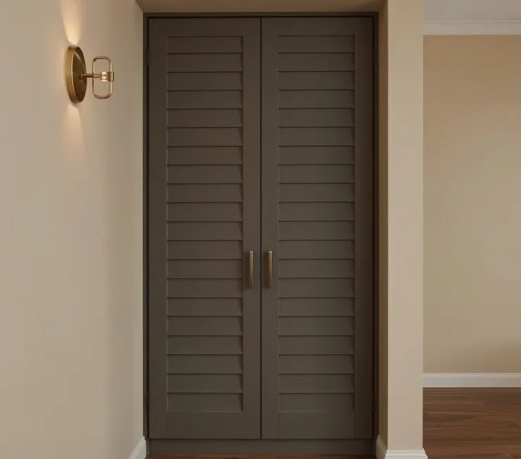 Эстетичный шкаф с лаконичным силуэтом и выразительной горизонтальной фрезеровкой на фасадах — идеальное решение для встроенного хранения в прихожей. Благодаря насыщенному тауповому оттенку и золотистым ручкам он гармонично впишется в современный или неоклассический интерьер. Контрастная текстура фасада добавляет глубины и делает модель визуально интересной.