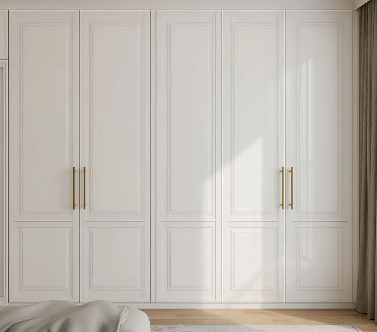 Встроенный гардероб в классическом стиле, выполненный в белоснежном цвете с элегантными фрезерованными фасадами. Высокие распашные дверцы с утонченными золотистыми ручками придают шкафу благородный и изысканный вид. Идеально подходит для спальни или гардеробной, создавая атмосферу легкости и простора. Вместительные секции позволяют удобно организовать хранение одежды, обуви и аксессуаров.